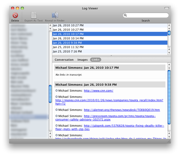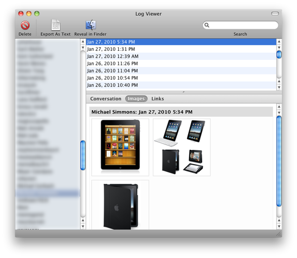 - Powerful, searchable log viewer that can also browse images and URLs from past conversations